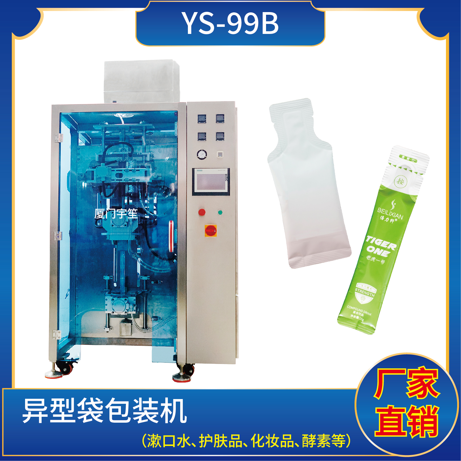 特 點1、適用于各行業(yè)中酵素、果汁、漱口水、洗護用品、染發(fā)劑、化妝品小樣等醬料、液體物品的異形袋計量包裝。